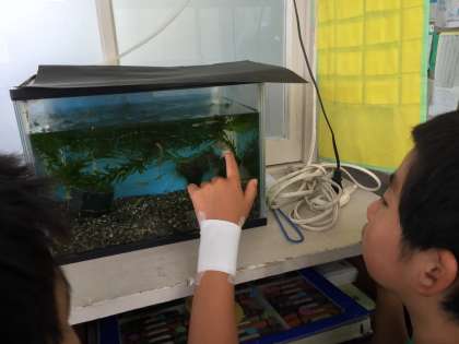 学校では、いろいろな生き物を飼育しています。5年生は、めだかです。オスとメスの違いや産卵、そして稚魚に孵化するまでを観察します。