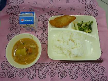12月最初の給食は「たらフライ」「さつまいものみそ汁」「菊菜と白菜のごまあえ」です。フライはカラッと揚げてあり、食感がよくおいしくいただけました。