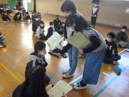 集会活動も再開しました。今日は1年生と6年生がペアになりゲームを楽しみました。舞台のカーテンの間をボールや赤白帽子などが行き来して、それが何かを当てるゲームです。1年生と6年生が話し合って答えを考えていきました。