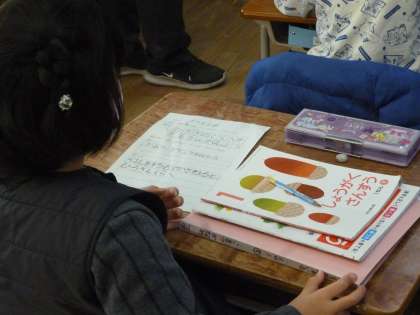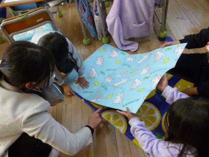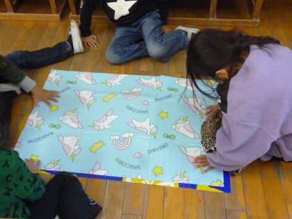 1年生は算数で2枚のレジャーシートの広さ比べをしました。実際のレジャーシートを床に広げ重ねたりしながらどのようにして比べたらよいか考えていきました。最後に写真のように教科書、ワークノート、ファイルの3つの広さを比べていきました。