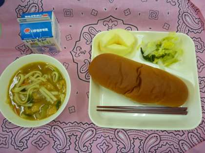 12月3日の給食は「カレーうどん」「白菜の甘酢あえ」でデザートにりんごがでました。カレーはうどんにしても大人気です。