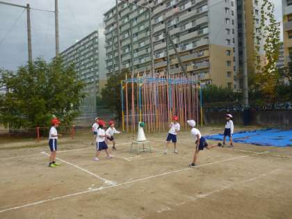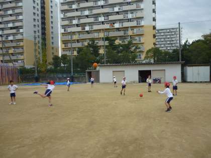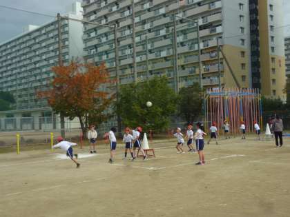 2年生はコーンを使ったボールゲームをしています。2チームで対戦し、攻め側が真ん中のコーンを当てます。守る側はコーンに当てられないように防御します。3年生のポートボールにつながるゲームです。はじめにキャッチボールをしてからゲームをして楽しみました。