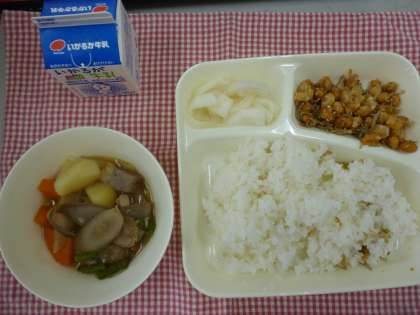 12月6日の給食は「鶏肉と野菜の煮物」「じゃこまめ」「かぶのゆず風味」という和風献立でご飯によく合っていました。