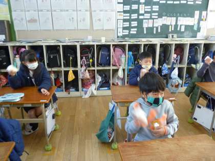 2年生はバター作りの学習をしました。はじめにバターの材料である牛乳の栄養について学習して実習が始まりました。生クリームを何回もかき混ぜ、できたバターミルクを除くとバターの完成です。クラッカーにバターをのせて試食しました。バターの持ち帰りは衛生上できませんが、作り方は持って帰っているのでお家庭でも作ることができます。