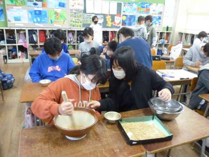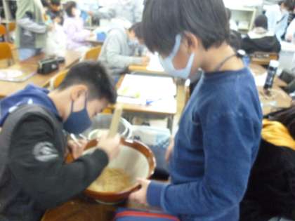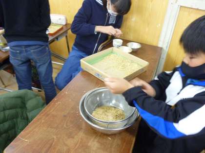 朝会でかかしの表彰を受けた5年生は自分たちが作ったお米を脱穀しました。もちろん機会がないのですり鉢を使って脱穀していきました。