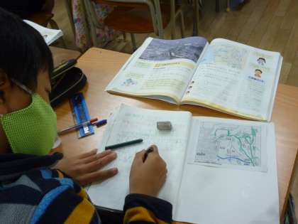4年生は大阪府について学習しています。今は大阪市の南側を流れる大和川について学習しています。今日は江戸時代に行われた大和川の付け替えについて学びました。