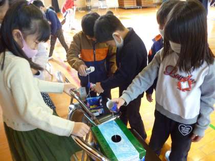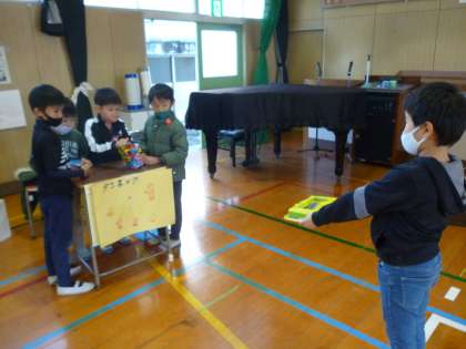 2年生はおもちゃを作ってきたことを紹介しましたが、今日は1年生を招待して、作ったおもちゃで遊んでもらう「おもちゃランド」をしました。全部で16のおもちゃブースがあり、2年生は1年生にていねいにやさしく遊び方を説明していました。2年生の作ったおもちゃはアイデアいっぱいの楽しい内容で、1年生は喜んでブースをまわり、楽しく活動していました。