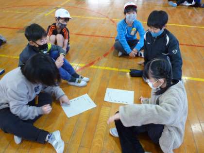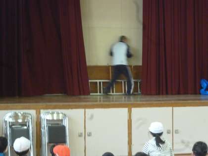 今日の児童集会は3年生と4年生のペア集会で、「フライングゲーム」をしました。カーテンの間をドッジボールなどの物が移動し、それを当てるゲームです。ペアのグループで移動した物を相談して答えを出していました。最後は先生が移動してゲームが盛り上がりました。