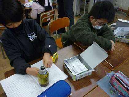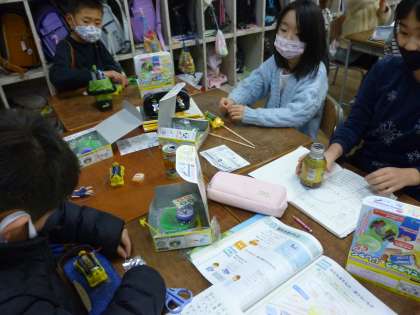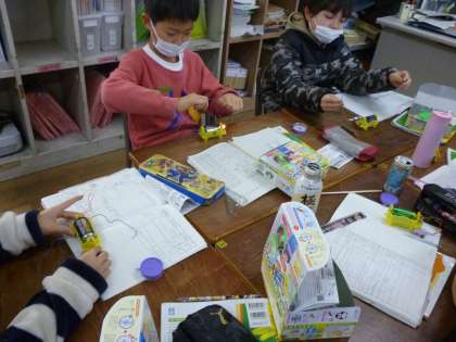 3年生は電池と豆電球を使って電気の学習をしています。空き缶を電線につなぎ、電球がつくか調べるなど楽しく実験を進めていました。
