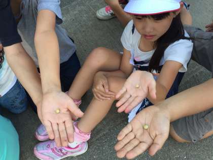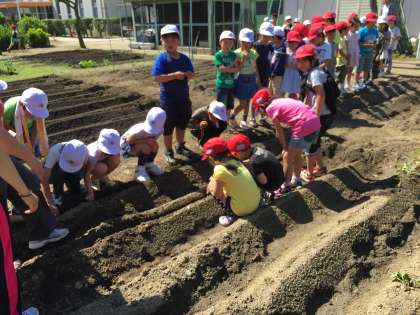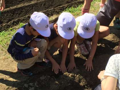 2年生はさつまいもに続いて大豆を植えました。夏休みが近づくころには、りっぱな枝豆ができたらいいですね。