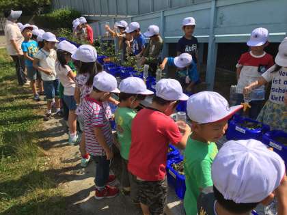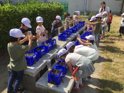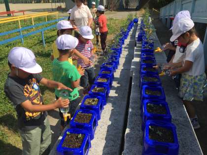 朝礼がおわった後は、みんなでアサガオに水をやります。小さな双葉が顔をだしています。