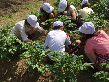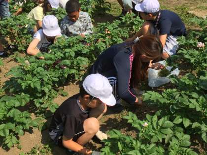 6年生のじゃがいも畑には雑掌が伸び始めたので、除草をしています。かわいい花も咲き始めました。じゃがいもの種は、この花のところにできます。じゃがいもとして食べているのは、地下の茎にあたる部分です。ちなみに、サツマイモは根の部分をいもとして食べています。