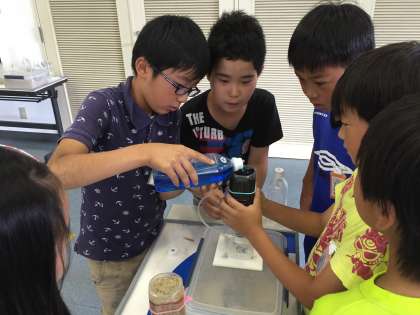 汚れた水や色のついた水を石や砂、活性炭でろ過する実験や水道管を流れる水の速さを体感しました。ろ過すると、無色透明で匂いもない水になり、みんな驚いていました。水道管を流れる水の速さは、歩く速さであることも教えてもらいました。