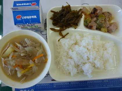 2月最終の給食は「まぐろの甘辛焼き」「豚汁」「くきわかめのつくだ煮」です。