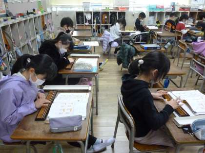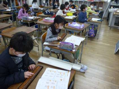 3年生はそろばんの学習を進めています。玉の置き方を習い、慎重に計算をしていました。