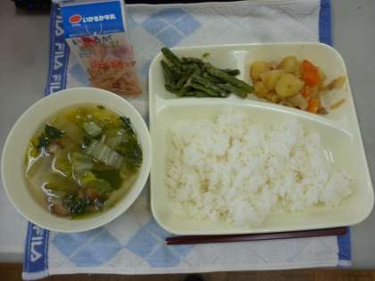 3月7日の給食は「変わり肉じゃが」「鶏肉と白菜のすまし汁」「三度豆のごまあえ」です。今日の献立は大阪市内の中学生が考案し、大阪市の「令和2年度 学校給食献立コンクール」で最優秀献立に選ばれたメニューです。
