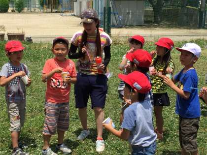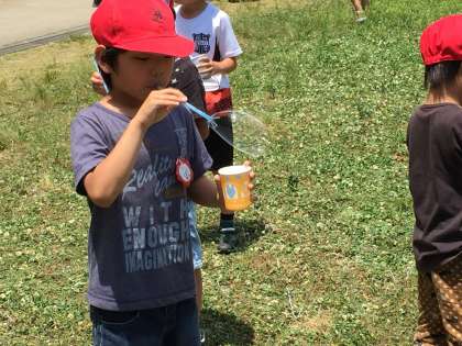 1年生がシャボン玉を飛ばしていました。大きいのから小さいのまで、いろいろなシャボン玉が風にゆれて、とてもきれいでした。