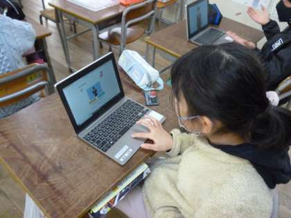 3年生は手話をタブレットで調べました。言葉を入力するとその言葉の動画を見ることができます。いろいろな言葉を入力し、手を動かして手話を覚えていきました。
