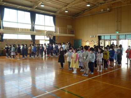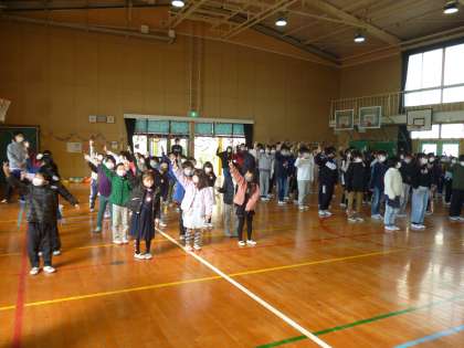 1〜5年生がお祝いの気持ちを手話で表しました。合唱ができないので手話による歌です。奇数学年は「虹」、偶数学年は「友だちになるために」です。これまで一生懸命に練習してきて、6年生に感謝とお祝いの気持ちが伝わりました。
