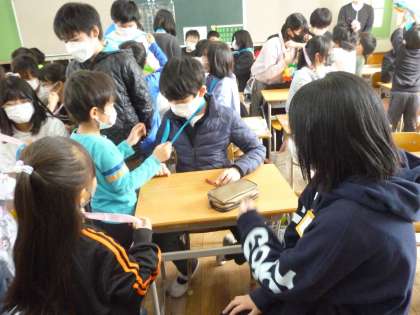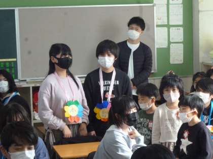 1年生は6年生にお世話になったお礼に「ありがとうの花」のメダルを作り、6年生の首にかけました。6年生は少し照れながら、嬉しそうにお礼を言っていました。