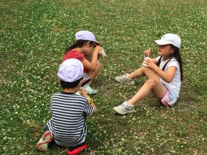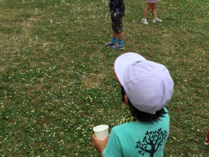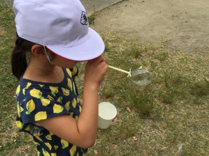 2組もシャボン玉をつくっていました。細かなシャボン玉がたくさんできて、風にのって飛びました。友だちと競い合って、楽しい時間でした。