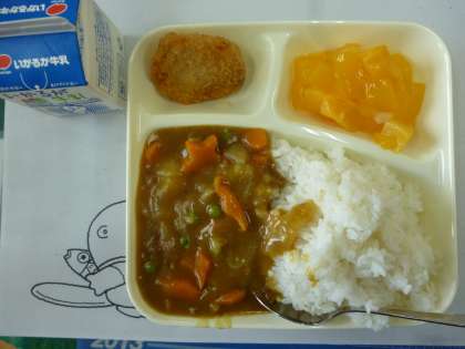 4月11日、本年度初めての給食がありました。献立は大人気の「カツカレーライス」「フルーツゼリー」と牛乳です。今日の給食は「入学お祝い献立」です。