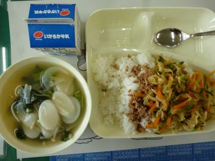 4月18日の給食は「ビビンバ」「トック」の韓国・朝鮮の料理献立でした。「ビビンバ」はご飯によく合い、おいしくいただきました。