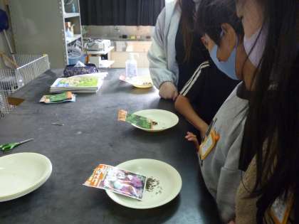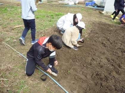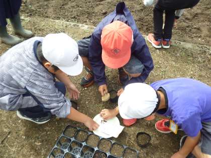 5年生は理科の学習で植物の種をまきました。夏から秋にかけて花を咲かせたり実を結ぶ「コスモス」「ヘチマ」「青じそ」です。種の観察をしてポットに種をまいていきました。