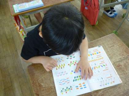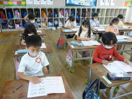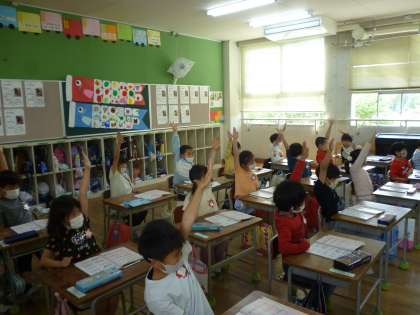 1年生は1〜9までの数字を習い、教科書の挿絵を指で数える学習をしていきました。しっかり手を挙げ、学習意欲満点です。