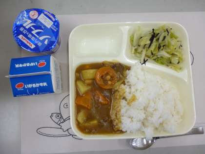 5月最初の給食は「牛肉と大豆のカレーライス」「キャベツのひじきドレッシング」「ヨーグルト」でした。今日は、ゴールデンウイークの間の日、子どもたちは、がんばって学校に登校しました。子どもたちの大好きな「カレー」が給食のメニューにでて、とてもよかったです。残さずしっかり食べることができました。