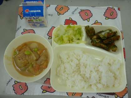 5月9日の給食は「ちくわのいそべあげ」「あつあげとさといものみそ煮」「あっさりキャベツ」です。「ちくわのいそべあげ」は昔からある献立で懐かしい味でした。