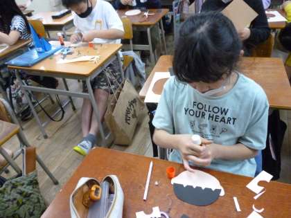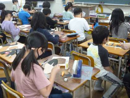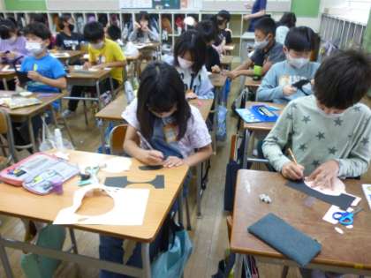 4年生は切り絵で自分の顔を作成していきました。黒色の画用紙で髪の毛の形を切り、顔に貼っていきました。これから目や鼻などの顔の部分を貼っていって完成させていきます。
