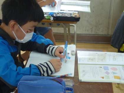 5年生は算数の学習で四角形をかきました。コンパスや三角定規など、必要に応じて使い分けて作成していきました。、