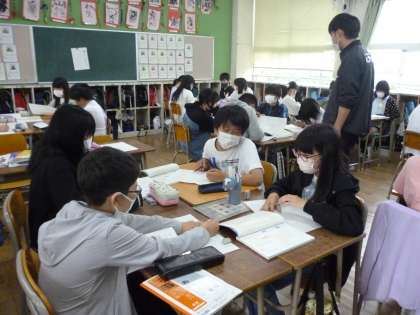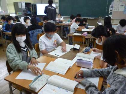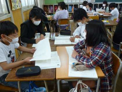 6年生はグループで意見の交流の学習をしました。テーマは「世の中の出来事を知りたい時に、テレビ、新聞、インターネットのどのメディアを選ぶか」です。まず自分の考えをワークシートに書き、グループで発表しあいました。そしてそれぞれの考えについて意見を述べ合いました。自分の考えをまとめる力、友達の意見を聞く力、友達の考えに対して自分の意見を述べる力が必要で、言語力を高めることができる学習です。