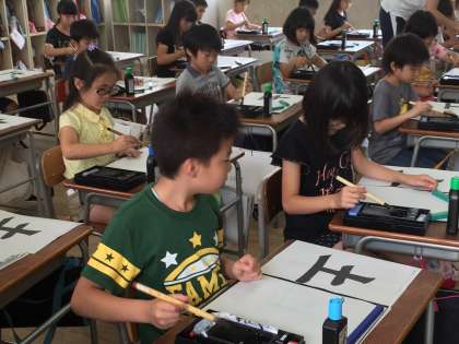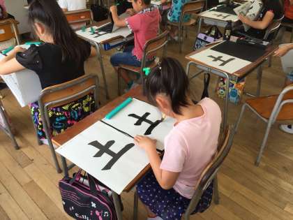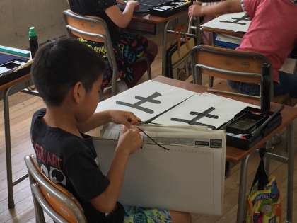 3年生になると、毛筆がはじまります。子どもたちは、思った以上に上手です。一筆ごとに心をこめて書いていました。