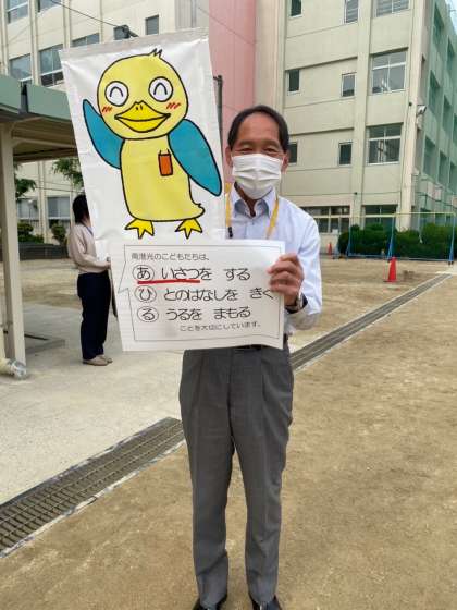 今日の児童朝会は「あひる」の話をしました。これは鳥のあひるではなく、本校で大切にしていることです。「あ」は「あいさつをしよう」、「ひ」は「人の話を聞こう」、「る」は「ルールを守ろう」です。これからもこれらのことをしっかり守っていってほしいと願っています。