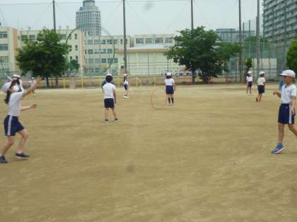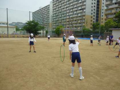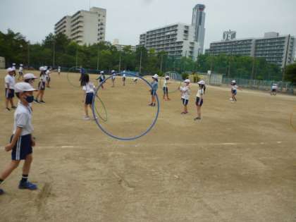 4年生はフラフープを使った運動をしました。パスをし合ったり、回転を付けて手元に戻らせたりとフラフープを操っていました。