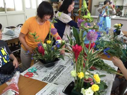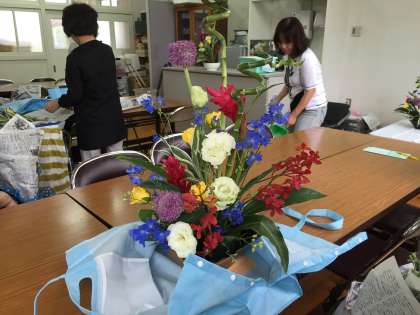 南港光小学校生涯学習ルームのフラワーアレンジメント教室の様子です。いつもきれいな花を生けて、校長室に届けてくださいます。すてきな作品に仕上がっていました。