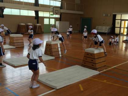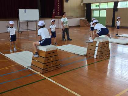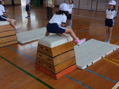 2年生はとび箱を練習していました。この種目も、鉄棒と同様に小さいことから親しむことが大切です。苦手意識がついてしまうと、ずっと飛べないままです。まず、とべるという体験をさせてやることです。