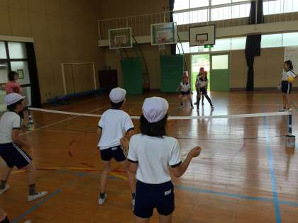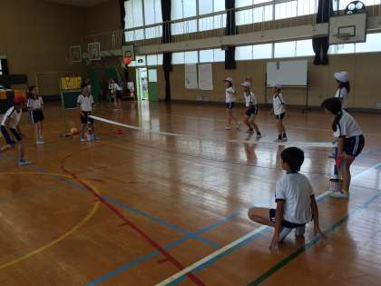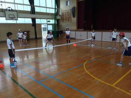 5年生がやっているのは、プレルボールといいます。小さめの柔らかいボールをワンバンドさせて、相手のコートに打ち返すというものです。バレーボールと卓球を足したようなゲームです。男女関係なく参加しやすいスポーツです。