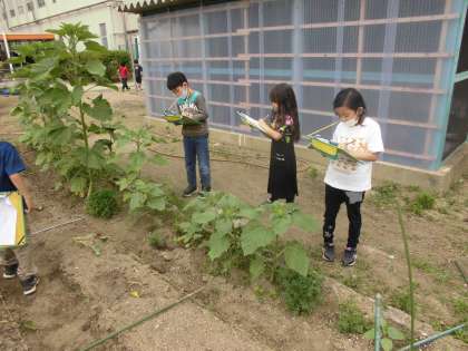 2年生はさつまいもの苗を植えました。手で苗をやさしく扱い、丁寧に植えていました。植えた後、苗の様子を絵と文章でかいていきました。
