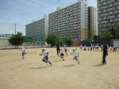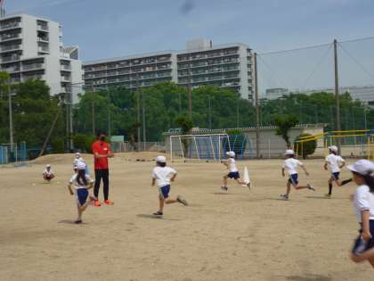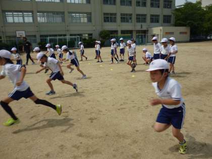 本校では3年生が年3回「NOBY運動プログラム」に取り組んでいます。このプログラムは南港の小学校を対象に、大阪ガス・住之江区役所様が企画・運営される陸上運動のプログラムです。3年生は速く走るための基本を教えていただき、全力で走っていきました。今日は北京オリンピック男子4×100mリレーの銀メダリスト朝原宣治氏が来られ、子どもたちに指導していただきました。
