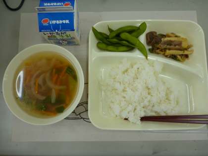 6月最初の給食は「チンジャオニューロウスー」「ハムと野菜の中華スープ」「枝豆」です。枝豆の献立で夏の到来を感じました。