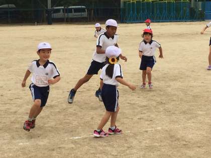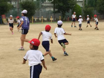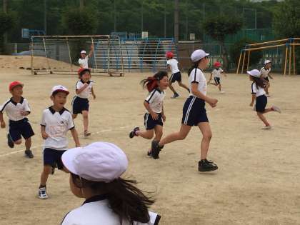 1つ目は、いろいろなおにごっこをしました。大きな6年生を追いかけて、1年生は大はしゃぎで、広い運動場を走り回っていました。