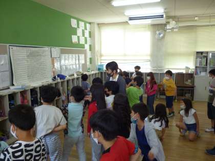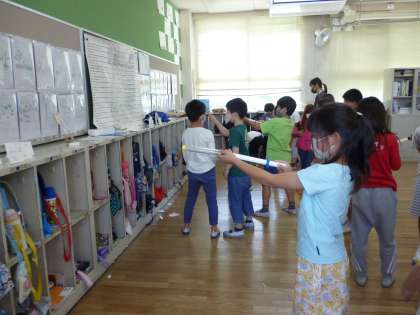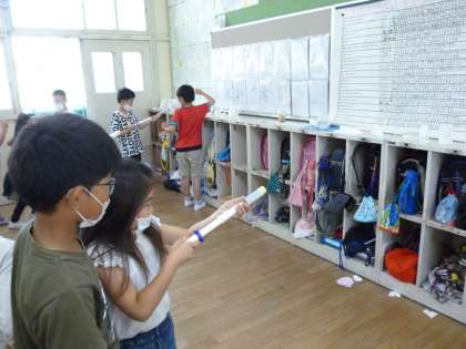 23日の「ひかりまつり」にむけて、各クラスは準備を進めています。2年生は「まとあて」のお店を出します。空気鉄砲を使うので担任から「人に向けて撃たない」などの注意を聞き、的に向けて撃つ試し打ちをしました。どのようにゲームの説明をするかなど、これからしっかりと考えていきます。