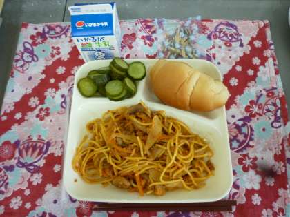 6月6日の給食は「スパゲッティミートソース」「きゅうりのピクルス」「アーモンドフィッシュ」です。パンは黒糖パンです。スパゲッティはいつも大人気メニューです。