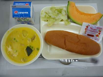 6月8日の給食は「かぼちゃのクリームシチュー」「キャベツのゆずドレッシング」でデザートにクインシーメロンがでました。メロンは甘い果肉でとても人気がありました。