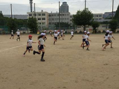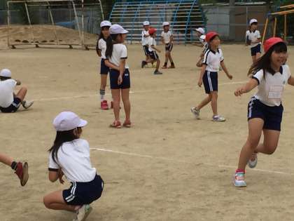 光オリンピックの最後は、3・4年生でした。年の差が小さいので思い切ってできるグループです。まず、おにごっこから始まりました。