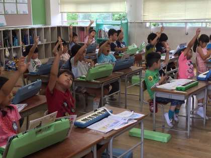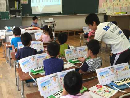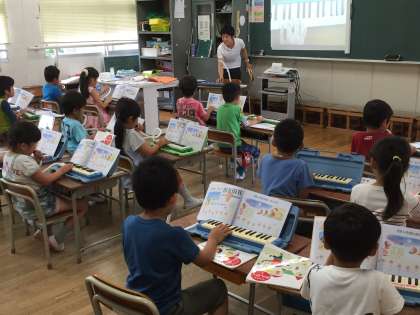 けんばんは個人差が大きいですが、初歩から指の動かし方を教えています。みんな安心して、楽しくけん盤ハーモニカを吹いていました。