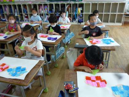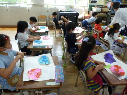 1年生はこの季節らしく折り紙であじさいの花を折り、画用紙に貼って作成しました。学習園では満開になったあじさいの花を観察しいました。